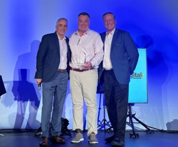 Ken Brown, BOBST product business development manager (center), receiving the award from Event Director David Pesko (L) and Chris Lyons (R).