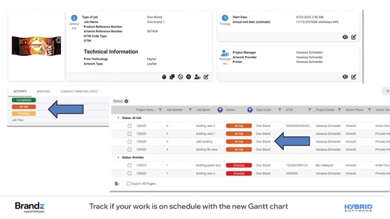 Artflow 25.09 helps brand teams hit their deadlines with less stress. Real-time Gantt chart tracking gives everyone a clear view of progress and more accurate delivery forecasts. Retro planning makes it simple to schedule backward from launch dates, ensuring approvals stay on track. Flexible revision times let each review stage get the attention it needs, while automatic alerts warn you early if deadlines are at risk.
