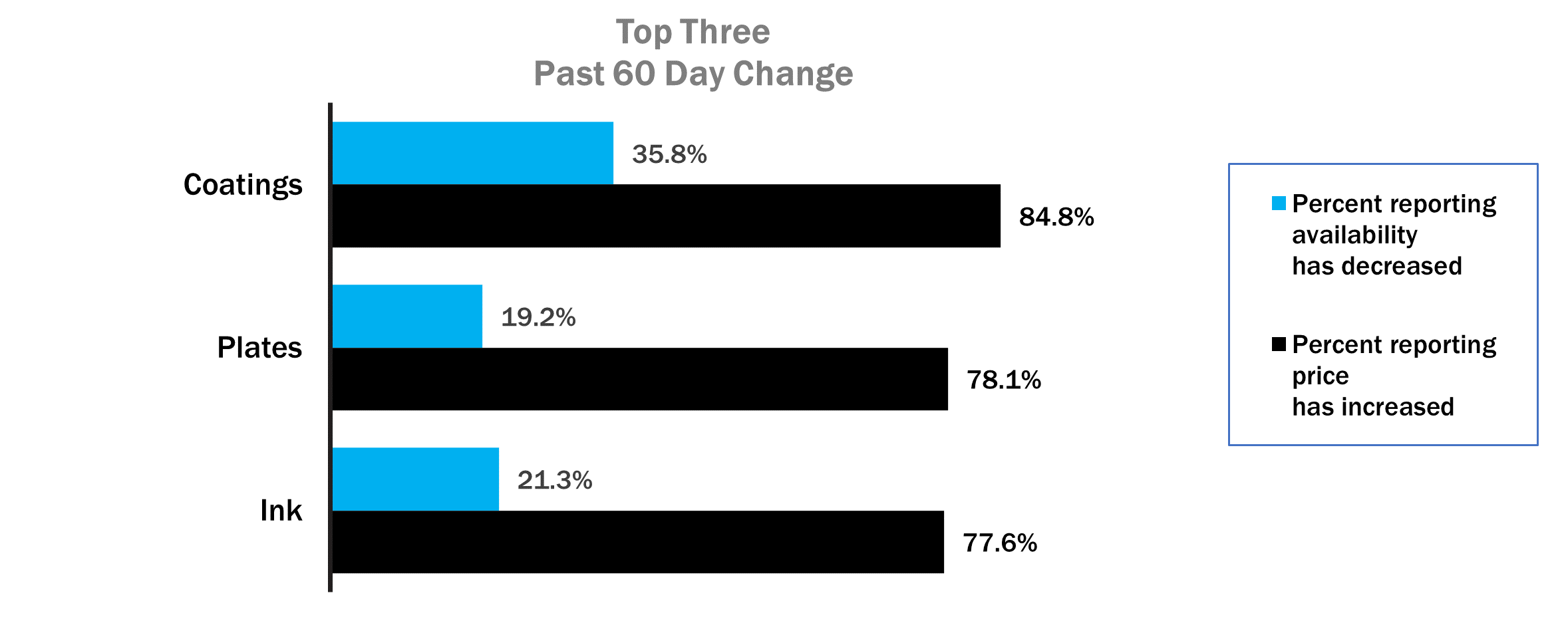 According to respondents, consumable availability remains mostly unchanged over the past 60 days, however prices, similar to substrates, have increased and continue to be a concern. Like substrates, companies were asked if they have seen consumable availability and prices increase, decrease, or stay the same over the last 60 days. Very few reported increased availability for ANY of the consumables measured and none said prices were lower. For each consumable measured, at least 6 in 10 respondents said that availability over the past 60 days had decreased and over 5 in 10 respondents said that they were seeing cost increases. The top three consumables shown to have decreased availability and higher costs, coatings, plates and ink, are shown below in figure 3.