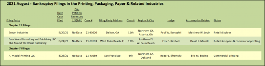 Despite the outbreak of Covid-19, the number of bankruptcies for the past twelve months across all segments decreased to 29 filings, down from 38 and 41 over the prior two years, respectively. We attribute this decrease to the huge cash infusions into businesses over the past year, structured as forgivable PPP loans and other forms of government stimulus. Another factor is likely the high cost of going through a bankruptcy proceeding versus simply winding down a business without the formal filing. As expected, even at the reduced level of bankruptcy filings, the commercial printing segment leads the pack. Of interest, bankruptcies in publishing decreased, presumably the market has been rationalized, at least for the time being. Consistent with our observations above about the wide-format segment, there was a notable uptick in bankruptcy filings.